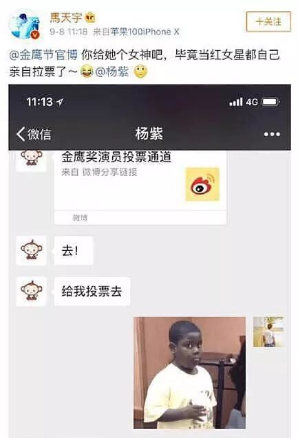 马天宇先是艾特了金鹰奖官微,开玩笑的说给杨紫个女神吧,并晒出了杨紫拜托他拉票的截图。