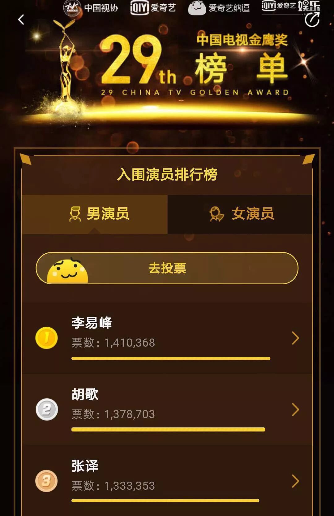 首先你们这次投的票是评选最受观众欢迎男女主角的。时间是8.15-9.24,票选出男女演员各两名。所以就不存在什么胡歌、杨紫遗憾落选来年再战的说法,因为本来男女演员就是各两个名额。