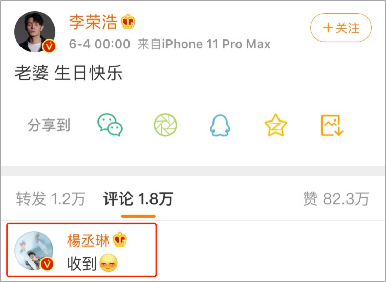 一句简单的“老婆,生日快乐”,杨丞琳回复“收到”。