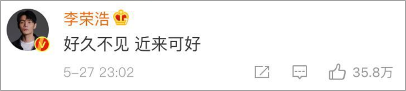在网络上,李荣浩的祝福总是很简单,很收敛— —