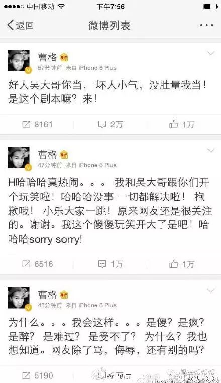 吴镇宇很快又与湖南卫视达成和解。因为当时并不是正式录制时间,没有摄影机录下具体情况,网友推测是孩子之间互相推搡而导致费曼摔倒磕伤了眼角。而因为被网友认为自己的孩子“推搡”伤害了费曼而遭受网民强烈谴责的曹格却在微博发飙“求清白”,但随后又删除了微博。保留了“我家小孩没有伤害Feynan”的声明。