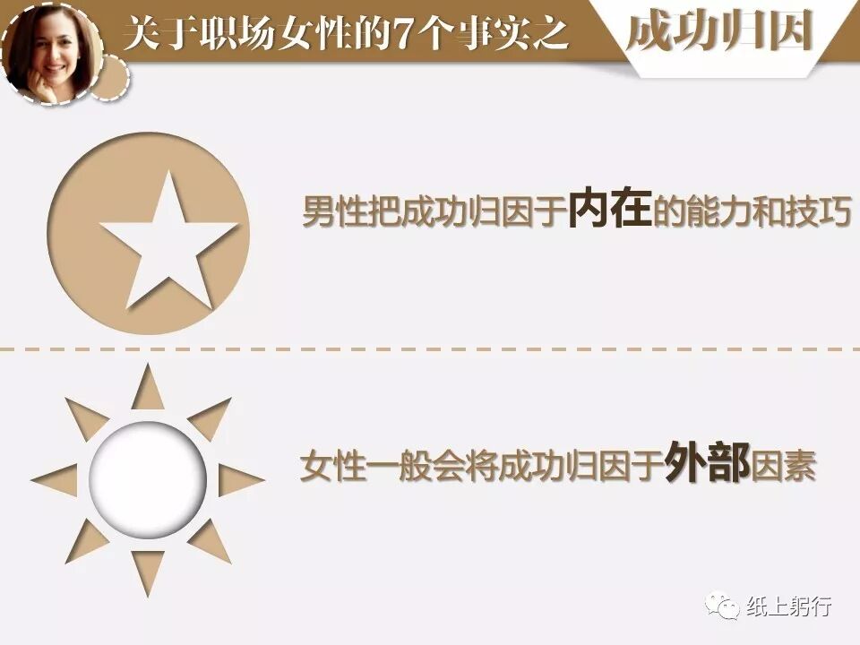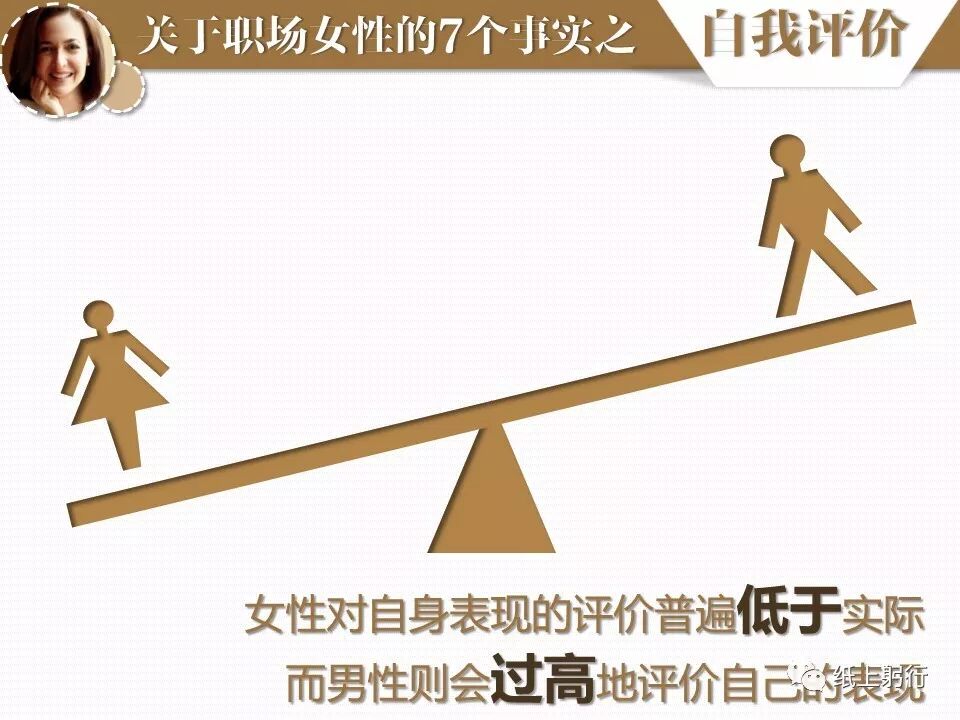 女性的一个倾向就是低估自己。比如说,当让一个男性解释自己为什么取得成功时,他通常会归因于自己的能力;而问女性同样的问题,她通常会归因为外部因素。而如果把问题换成解释失败,男性通常会认为这是外部因素,女性却会认为是自身能力不足。