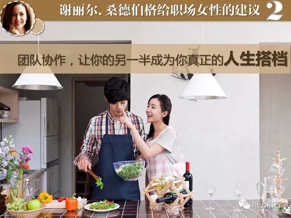 对于职业女性如何兼顾工作和家庭,桑德伯格认为女性需要帮助丈夫成为自己真正的生活搭档。在事业成功的女性中,绝大多数都拥有全力支持她们事业的伴侣。没有配偶的支持,女性难以在事业上全力以赴。尽管女性已经走向职场很多年了,但社会传统还是期待女性从事更多的家务,花更多的时间照顾孩子。