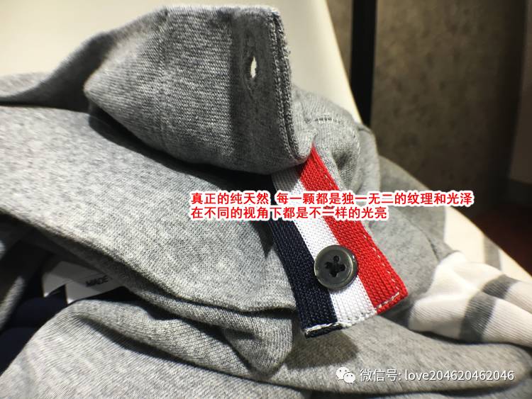 图其次就是圆领卫衣边上的都是纯天然的贝壳扣,每一刻都是独一无二的文理和光泽,这个是一般市面货不会有的。
