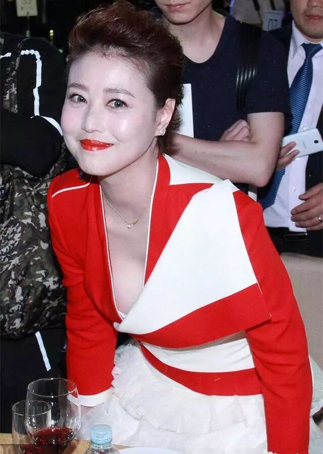 头发盘起身穿红色深v连衣裙,这傲慢的上围也是让大家羡慕不已,不得不说周海媚的身材很好。