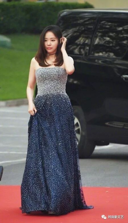 一袭抹胸连衣裙,上身银色,下半身藏蓝色,裙身上点缀着亮钻,一身blingbling的特别闪。她一手拎着裙摆,一手撩着头发,气质出众。