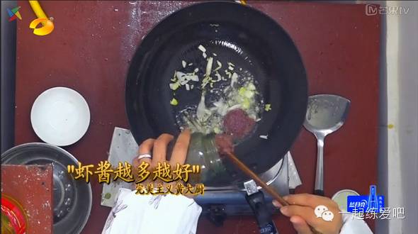 第一天的第二顿饭,黄晓明做了他自己爱吃的虾酱炒鸡蛋,放了半瓶虾酱!半瓶!