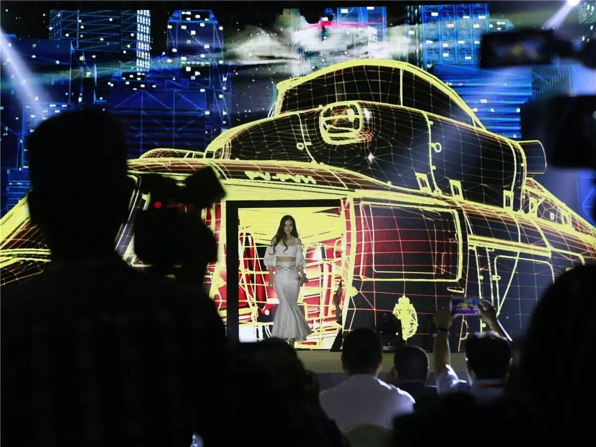 在虚拟LED画面里,从直升机“真实”的门里出来,噔噔噔噔~欢迎Angelababy!!!
