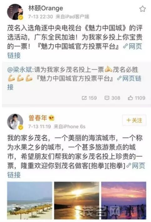 茂名籍著名电视节目主持人、歌手、演员,《同一首歌》主持梁永斌也在利用自己的微博为茂名拉票,“请为我家乡茂名投上一票,茂名必胜!”昨天上午10时21分,茂名籍著名歌手弦子在微博为茂名投票助战:“早起投票,为茂名加油!”昨晚22点05分,茂名籍香港著名歌星古巨基也利用微博为茂名拉票:“兄弟姊妹请给我的家乡茂名投票啊!帮我投票的各位祝你颜值马上飚升100%。”