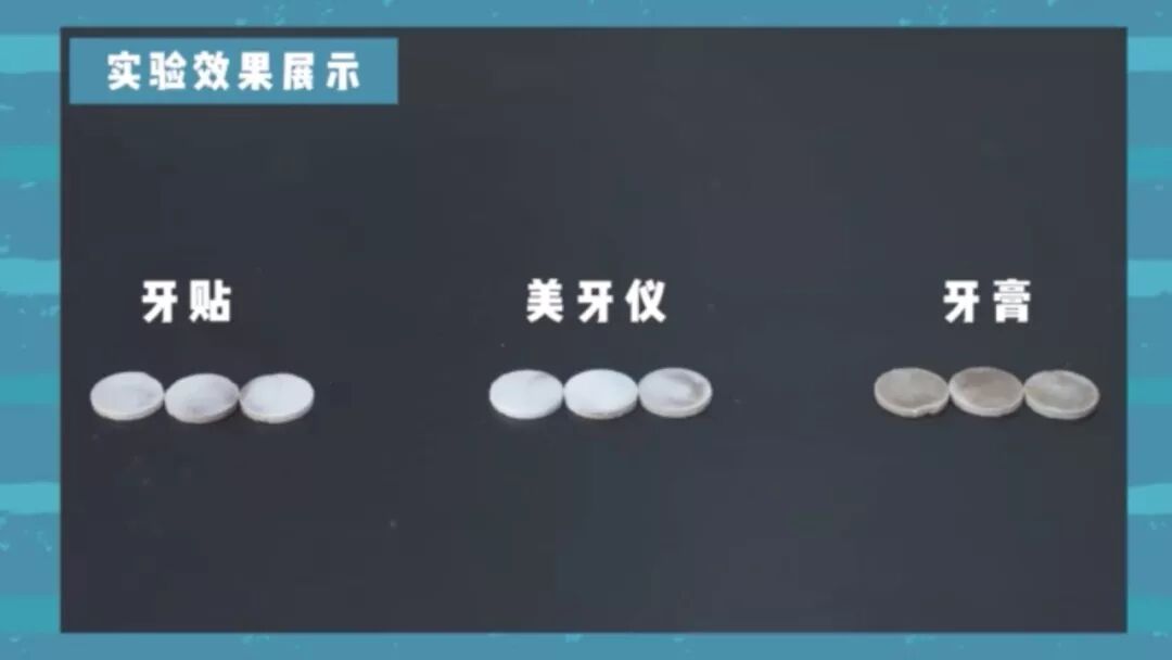 选用了和牙齿成分接近的牙片,模拟真牙,浸泡在红茶、酱油和红酒中整整两天,再分别用佳洁士牙贴、高露洁凝露+美牙仪以及人称“牙膏中的爱马仕”Marvis牙膏进行美白效果实验。