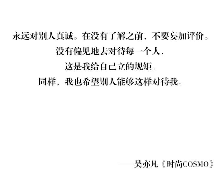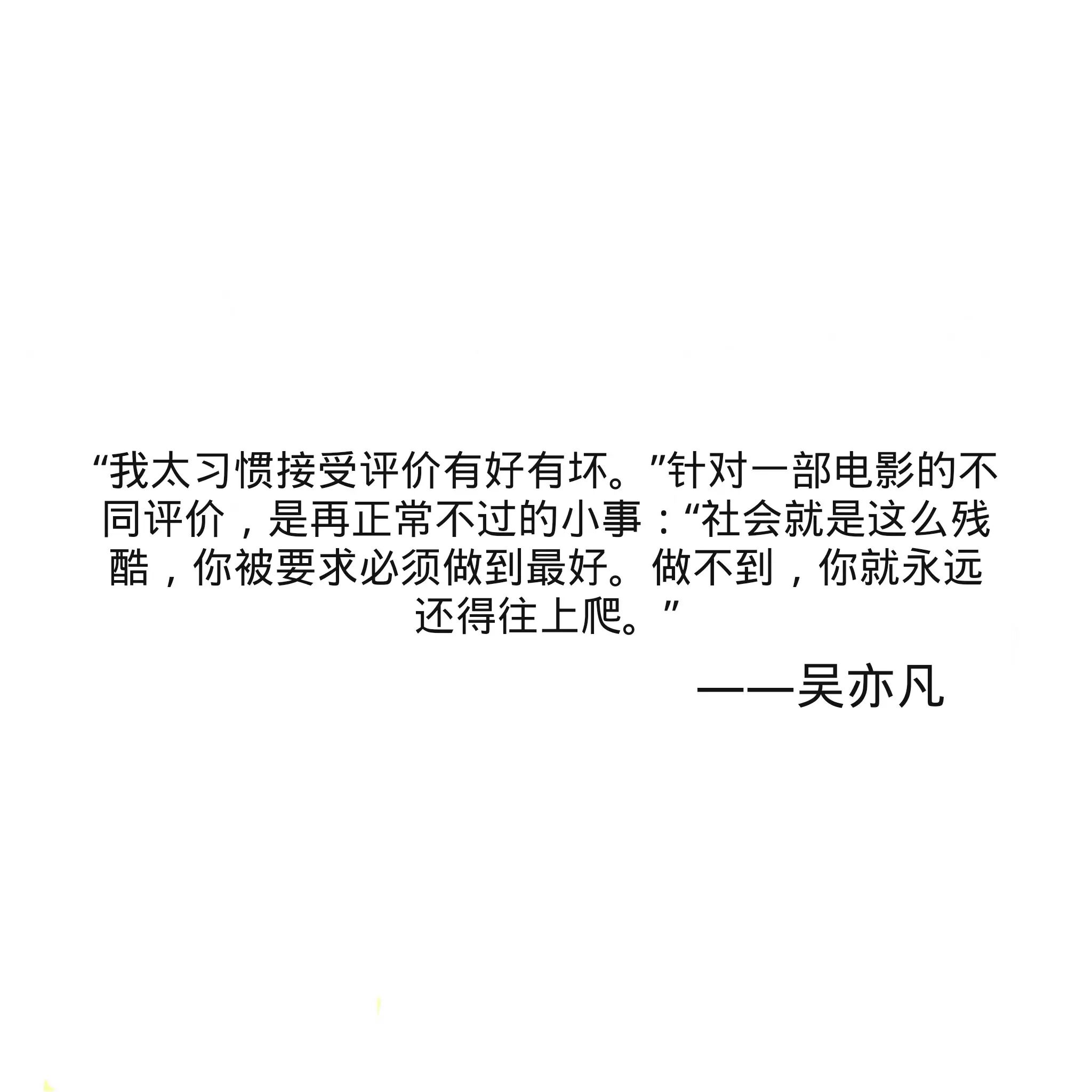 嘉人专访他说:“我每天都在做着真实和坦荡的事,只不过接触的人少,很多事别人没看到。” “我不想成为一个明星,我想成为一个真正有作品的人,不管是电影也好,音乐也好。获得关注度是很好的,但想要长久,就不能仅仅以一个明星的方式。”“逆境使人成长。如果说你被它打败了,你可能就没了,但你如果坚持的话,你会发现你永远都不可能被打死。”