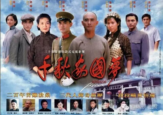 《千秋家国梦》是90年代一部超级文艺大作,用30集的容量将颇为传奇的政治文艺世家——许氏家族(许广平的家族)的家族史以文艺风骨娓娓道来。本剧阵容在当年可谓超级强大,四代人能扩了两岸三地当红的明星——赵文瑄分饰第一二代许氏长辈、关礼杰和胡兵演第三代、吴大维演第四代,更有黄磊、李婉华、张延、潘虹、孔琳等诸多明星参与其中。瞿颖依然跟胡兵演一对民国时期的红色情侣,类似“与妻书”的林觉民与妻子陈意映的爱情悲歌。