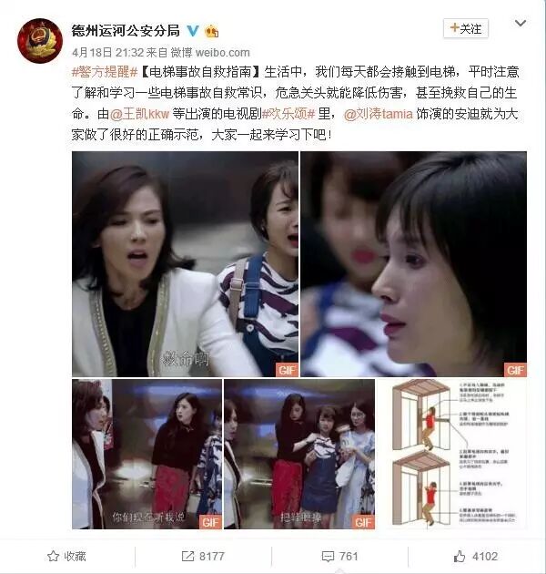 4月18日晚21点多,每经小编(微信号:nbdnews)看到,@德州运河公安分局 发了一条微博,提醒各位网友如何在电梯事故时自救,配图竟然出自刚播出的电视剧《欢乐颂》!