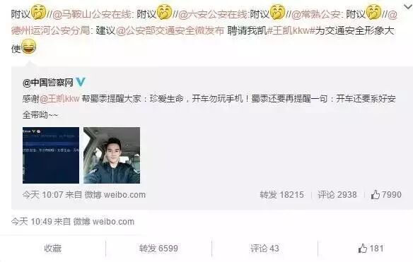 到目前,每经小编(微信号:nbdnews)已经统计不清多少公安大V借王凯这条微博来推广交通安全知识了,你能看到警察蜀黍们为了大家的安全出行有多拼了!