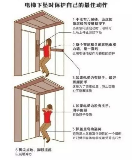 “把鞋脱掉,头和背部紧靠厢壁,双腿微微弯曲,这样的话,就算是电梯急速下坠,我们都能够减少对人体的伤害。”