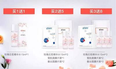 超值组合3瓶装,原价198元/瓶,特惠294元/3瓶,并赠送价值369元专属大礼包一份:玫瑰花苞精华水15ml*3+雪肌面膜片装*2+蚕丝面膜片装*3。