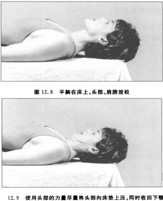 2,使用头部的力量尽量将头部向床垫上压,同时收回下颚(直视天花板的同时尽量将头部向后移动)