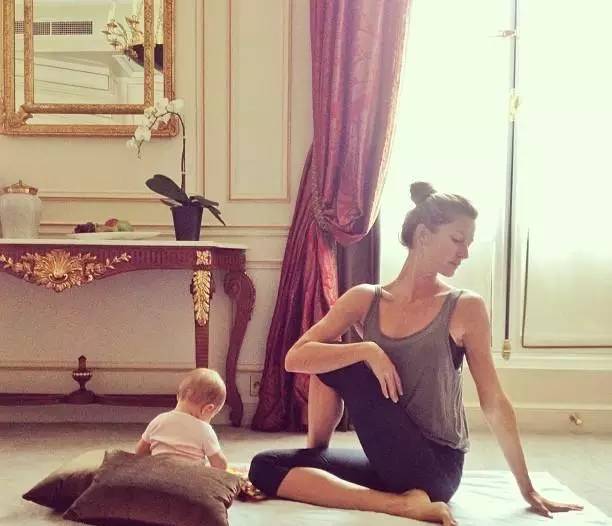 许多大牌奢侈品的超模广告宠儿——吉赛尔·邦辰,她就连在家带孩子也不耽误练习哦!