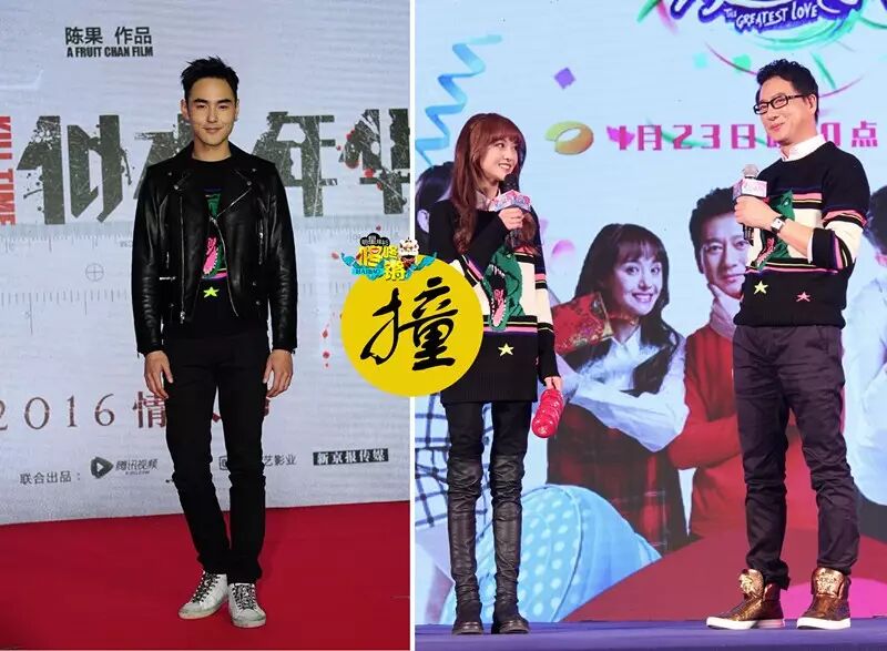 除了自带中性style的搭配,男装女穿也是不错的选择。日前,阮经天身着SAINT LAURENT 2016春夏男士系列霸王龙织花毛衣亮相 《谋杀似水年华》 发布会,与软妹郑爽撞衫。阮经天并没有外搭走秀款的金色流苏皮夹克,而是选择了更为简洁的机车皮衣,简单清爽。下搭黑色长裤和白色绑带休闲鞋,运动感十足。虽然我大海报时刻提倡环保和不浪费,但是好歹也是去参加发布会,咱能出门前擦擦鞋吗?