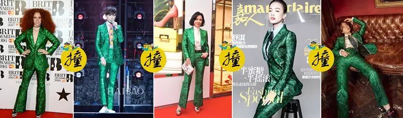 在娱乐圈谈起“中性”,自然得是wuli春春了。自从李宇春在某台跨年晚会身着GUCCI 2016春夏系列正绿色轧花面料套装亮相后,这款中性西装就火到不要不要的。截止上周,已经与刘嘉玲、袁姗姗、舒淇、杰斯-格莱茵四位女星撞衫。李宇葱,哦!对不起,春。为了与走秀版区分,机智的把瓢虫版领带换成了菠萝款。嘉玲姐选择内搭宫廷高领白衬衫,虽然领口也出现了类似领带的设计,但整片的白加绿,显得过于单一。复古黑色皮带与黑发略显老气,好在银色手包与bolingboling的凉鞋组合有了加分效果。
