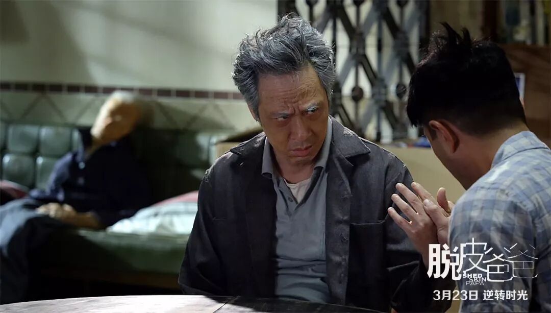 电影中,他每脱一层皮都可以年轻一点,就这样一直从79岁的高龄老父一层一层蜕变,直至重回19岁,让饰演儿子的古天乐吃惊不已。