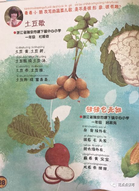 特别2:童谣中的蔬菜是有颜色、有动作、有样子、有心情、有大小的,比如:辣椒满身红、茄子一身紫、小葱端起银杆枪、茄子一挺大肚皮、莲藕斗得劲头儿足、胡萝卜急得搬救兵等等,很形象,很有“画面感”。