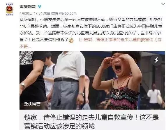 4月30日,面对网上的爱心接力,重庆市公安局网安总队在其官方微博和微信上发布了一则名为《链家,请停止错误的走失儿童自救宣传!这不是营销活动应该涉足的领域》的文章。文章矛头直指链家门店成为中国失联儿童守护站,并表示“该企业的这项‘善举’还真该被打个大大的问号”。