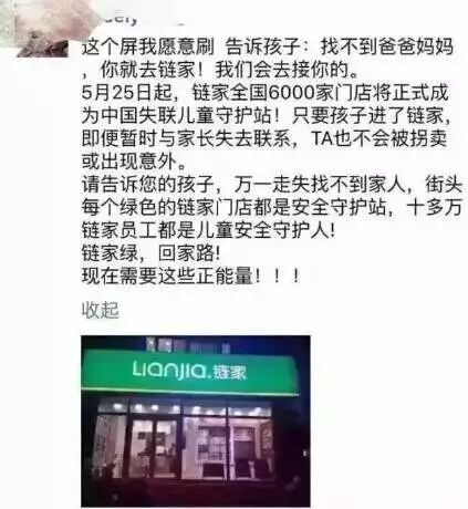4月30日,不少人的的朋友圈被一场“爱心接力”刷了屏。文中称,从5月25日起,链家全国6000家门店将正式成为中国失联儿童的守护站。