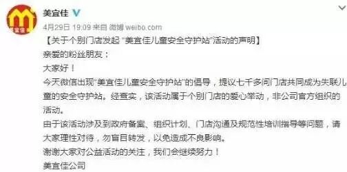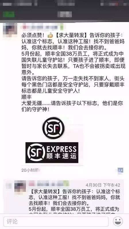 而这轮“爱心接力”当中,也不仅仅有做房产的链家。这段还被替换为“美宜佳”(便利店)、“顺丰”(快递)等各个版本。一时间,似乎大量的连锁行业门店都成为了中国失联儿童守护站,这起活动也让不少人开始产生质疑:到底是商家的宣传活动,还是真心实意的爱心行动?