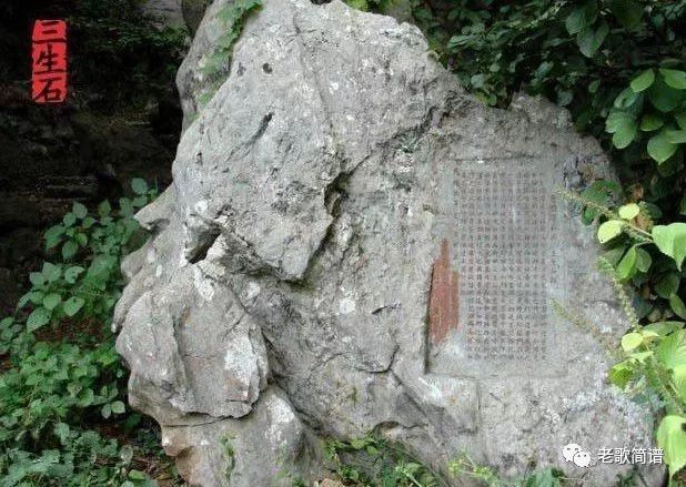 三生石位于杭州三天竺寺,传说唐李源与僧 圆观 友善,同游三峡 ,见妇人引汲, 观曰:“其中孕妇姓王者,是某托身之所。”更约十二年后中秋月夜,相会于 杭州 天竺寺 外。是夕观果殁,而孕妇产。及期, 源赴约,闻牧童歌《竹枝词》:“三生石上旧精魂,赏月吟风不要论。惭愧故人远相访,此身虽异性长存。” 源因知牧童即圆观之后身。见唐 袁郊 《甘泽谣·圆观》。后人附会谓杭州天竺寺后山的三生石,即李源和圆观相会之处