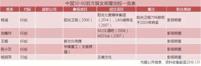 (表格:中国50-60后文娱女明星创投一览表)