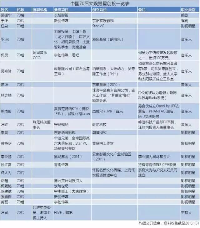 (图表:中国70后文娱男星创投一览表)