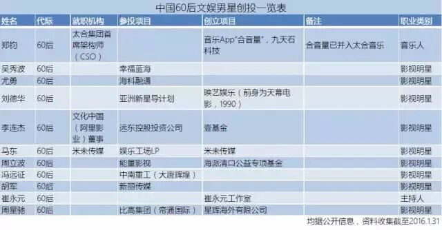 (图表:中国60后文娱男星创投一览表)