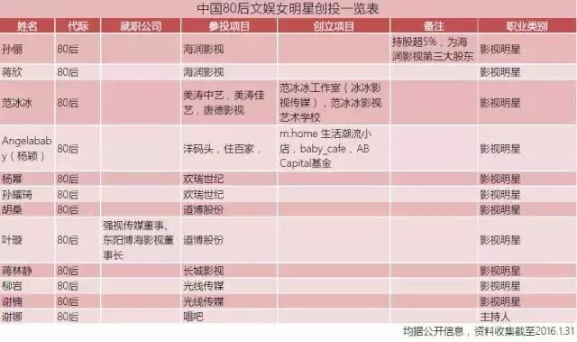(表格:中国80后文娱女明星创投一览表)