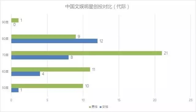 ②中国女性文娱明星投资居多,创业者偏少 ;入股将上市的公司、坐等红利者居多,亲自参与投资管理者少。现在,我们用可视化图表,从性别、代际和职业类别的角度来对比一下中国文娱明星创投者的异同。