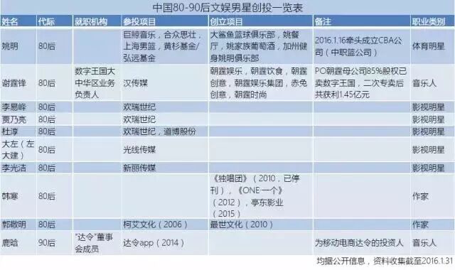 (图表:中国80-90后文娱男星创投一览表)