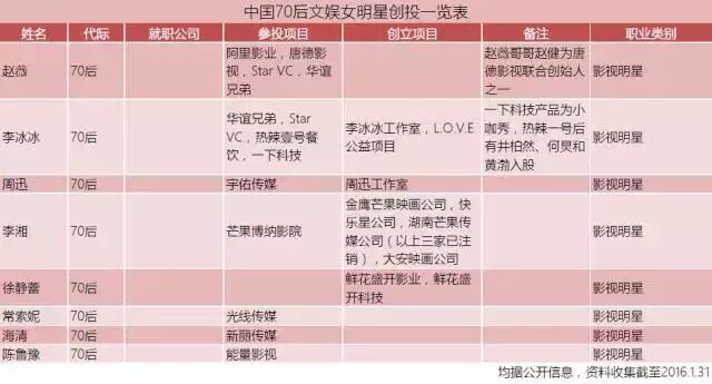 (表格:中国70后文娱女明星创投一览)