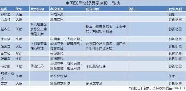 (图表:中国50后文娱男星创投一览表)