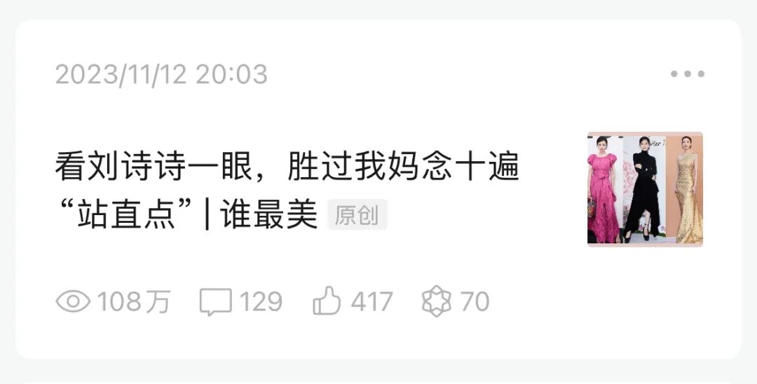 100万人看过我夸刘诗诗! | 2023年终总结系列 西瓜小姐 内地女星 2023-12-27 20:47:25 420 创作不易,用心坚持,欢迎请BaGua喝几杯爱心咖啡!打赏并支持本文 打赏并删除本文 2023年终造型总结来啦!毫无疑问,看到这个主题,你第一个想到的人,应该是突然觉醒的古力娜扎。这三个月,疯狂输出盛世美颜。但是2023年,真的不是只有她!还有逐渐变成大花的85花,比如100万人看我夸刘诗诗的黑天鹅造型!还有永远不会让你失望的中国超模,比如已经在四大时装周拿下6大蓝血走秀成就的贺聪。还有,我偷偷藏的几个彩蛋,一定看完哦!给新面孔一点关注,或许她们也有很多惊喜。张婧仪95花的最佳造型,我选张婧仪。巴黎早秋的阳光洒在她脸上的那一刻,裙子幻化成金色羽毛,折射出圣洁的光。她美得像是神女下凡,拥有悲悯众生的温厚气质。娜然她的的龙骨裙,真是让人过目不忘。一个转身的瞬间,冲破了黑色封印,现出龙女金身。就像是小时候看电视剧里的龙族少女,闯出暗无边际的牢笼,无数次生死动荡,在熊熊燃烧的烈火之中,唤醒了血脉之中的金色龙骨,在大结局给魔王致命一击。杨超越杨超越也终于带来了她职业生涯的最佳造型。一朵正在盛开的水仙花,悄然无声在少女身上绽放。她简单盘起的长发,露出精致小巧的脸庞,是被爱滋养的小花,是洋娃娃苏醒了灵魂。田曦薇她拥有充满辨识度的梨涡,大大的眼睛闪动着清澈的光,笑起来让人陷进童话故事里。那天是阳光刚刚吹散晨雾,有一只森林中刚刚化为人形的小鹿,在湖水边快乐的跳跃。刘令姿她没有很红,很少上热搜,但是我总是偏爱她。刘令姿式少见的高挑冷艳,没有任何讨好感。第一次参加时装周,她也毫不怯场,不仅没有被黑色大衣压倒,反而穿出了清冷孤傲。“85花”正在变成“大花”稳定输出,很难失手。刘诗诗刘诗诗这一年有好几个分数极高的造型,但是和繁华盛大的礼服比起来,很多人念念不忘的,却是一身黑衣的她。紧身黑色上衣一丝不露,把身形气质展露无遗。柔美的身体线条藏着日积月累的自律力量感,是一种终于淬炼出坚韧内核的成熟魅力,让所有璀璨华服,都相形见绌。走错方向之后,她的停顿和转身,没有一丝慌乱和失措。以前都说她像一只优雅的天鹅,现在才明白黑天鹅比白天鹅更摄人心魄。倪妮倪妮的绝招,总是四两拨千斤。那种瘦而不柴的白皙丰腴之美,被薄如蝉翼的金纱温柔包裹着,恍然间不知道随风闪动的粼粼微光,究竟是来自裙摆,还是来自完美的她。刘亦菲简单的缎面礼服,把莹润的美,衬出高贵的光泽感。冬季的雨还绵延不尽,沉默的人群行色匆匆,不知所踪的公主终于班师回朝,会冲破阴雨,会吹散云雾。古力娜扎最后,我选了Vogue盛典的古力娜扎,是衬托她美貌的巅峰之作。一出场,空气里都带着馥郁的香气,所有人的呼吸都停滞了一秒。白色羽毛衬托着繁盛的容颜,像是一颗流光溢彩的钻石,每一步都是如梦似幻的绝代风姿。这种大胆的、娇艳的、美而自知的风采,让她变成了拥有万年修为的九尾白狐,是万妖女王,冰封万里,雪漫金山。记住,男人,从此只是掌中之物。迪丽热巴年底的她,失手几次。但是我一直记得三月的她,那身粉色礼服太明艳了,是春日盛开的桃花,灼灼其华,艳艳无双。她一笑,仿佛整个世界都飘起了花瓣雨,让你走进了一个灿烂的世外桃源。功成名就的影后,穿的不是衣服,是人生杨紫琼拿到奥斯卡最佳女主角的杨紫琼,在名利场派对上穿的Armani Prive高级定制礼服,有一种含蓄而庄重的东方力量感,整个人散发出来的自信光彩,胜过所有超模星光。惠英红Vogue盛典虽然潦草,却有无数精彩造型。“中国设计”的主题里,看到她就仿佛看到了一整个大潮起香江的岁月风云,穿出了踏过风起云涌的峥嵘过往,穿出了跨过刀山火海的金身不假。舒淇我永远为舒淇意乱情迷,就是难以自己被她吸引。白色裙子亲吻着她的肌肤,浓郁的宝石抢不走她的风采,突然理解为什么人们总是苦苦寻找世界上最璀璨的宝石配女人,因为在这一刻,真的光彩夺目,美丽无双。最后你可以永远相信中国超模。刘雯只要刘雯不退休,这个国际时尚界,永远有我表姐的位置!好莱坞名利场派对上的Gucci蕾丝透视西装,明朗大气,自信动人,把性感和帅气合二为一,如点点繁星,如璀璨银河,是夜色都无法隐没的高贵。别问,问就是把刘雯给我锁在红毯上,永不退休!奚梦瑶曾经摔下的一切,都要走回来了。Vogue盛典那天她简直就是天才艺术家耗尽一生心血才能创作出来的雕塑,完美的曲线,超凡的气质,无悲无喜的圣洁感,这就是超模应有的样子。贺聪很多年前,贺聪被称为“东方瓷娃娃”,时至今日,她进化成了棱角锋芒的金身娃娃,不易碎,不好惹。英国时尚大奖,黑色镂空长裙,近乎完美的曲线,毫无邪念的美丽。彩蛋一穿新中式的杨幂。比红毯上的她,更让人心服口服。杨幂在生日的时候穿的那一套真丝宋锦套装太美了,你忍不住停不下来,你忍不住细看她衣服上的每一个细节,你忍住忍不住欣赏碧绿的戒指,真是华美浓郁。丝滑的锦缎浮动出不同的光影,耳边的翡翠比钻石还耀眼,整个人散发着一种慵懒闲适又矜贵细腻的美感,看起来如此温柔,却不怒自威。彩蛋二穿Miu Miu的吴彦姝。原来少女感可以用这样优雅隽永的方式存在,黑色套装端庄持重,但领口和袖口的白色衬衫花边,带来了纯真的心意。女孩的善良真挚,女人的细腻温柔,可以