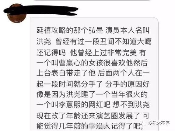 接着曹赢心的闺蜜,叫刘力硕的,在微博上爆料,总的来说,就是洪尧是个大猪蹄子,对前女友不好,劈腿什么的。