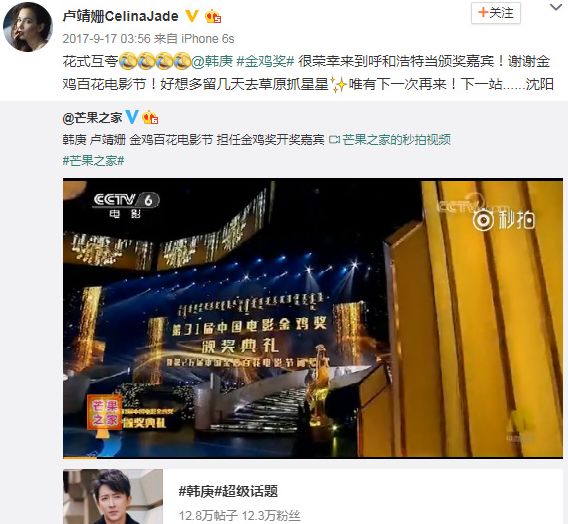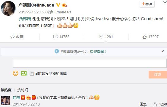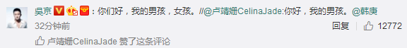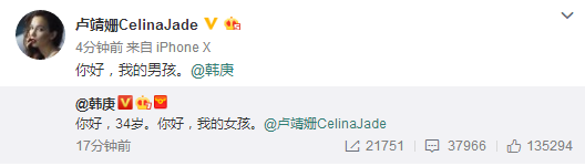 今天韩庚生日,下午韩庚突然就在微博上公开恋情:“你好,34岁。你好,我的女孩。”并@了《战狼2》女主卢靖姗。过后,卢靖姗回复:“你好,我的男孩。”
