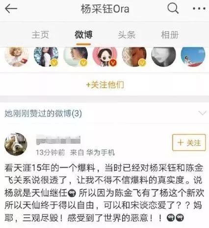 昨天有“翻版刘亦菲”之称的演员杨采钰曾点赞了一条关于刘亦菲的爆料微博,网曝杨采钰是刘亦菲的继任,陈金飞有了杨彩钰后就放了刘亦菲自由,而点赞的杨采钰不知是有意还是手滑,之后就又取消了点赞!