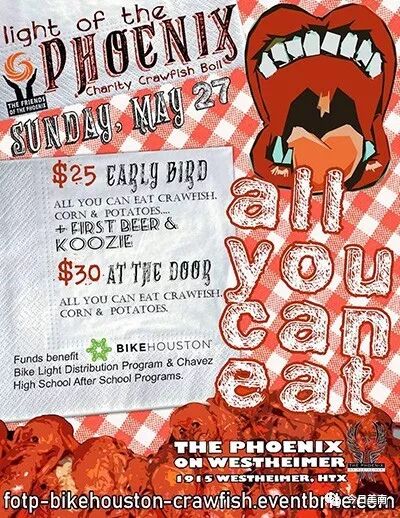这周天将在Westheimer上的The Phoenix举办小龙虾盛宴,届时将有无数新鲜出锅的麻辣香嫩小龙虾,还有水上滑梯、弹跳房子等一系列游戏设施。门票包含所有你能吃得下的小龙虾、玉米及土豆,管饱。