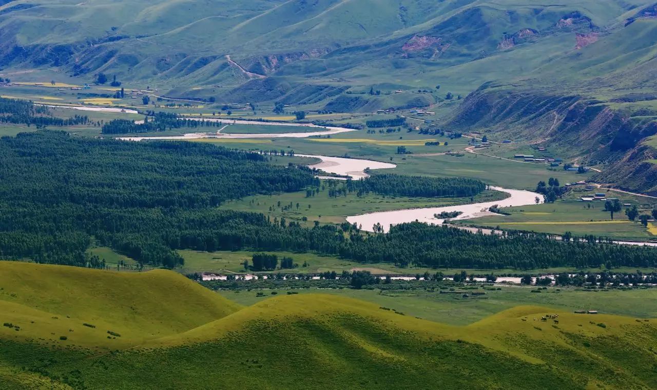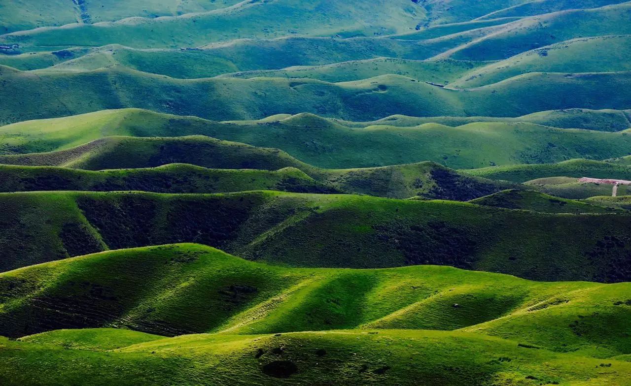 浮云追逐着白炽的太阳,洒下大片大片的云影。山鹰悠缓地在高空盘旋。蓝天白云下,满眼丰丰盈盈欲溢欲滴的绿。那绿,太稠太浓却不腻,就连漂浮着淡淡泥味儿草香的空气,都染上了透明的碧翠。世界上少有的一流天然草场,依山傍河,美不胜收。