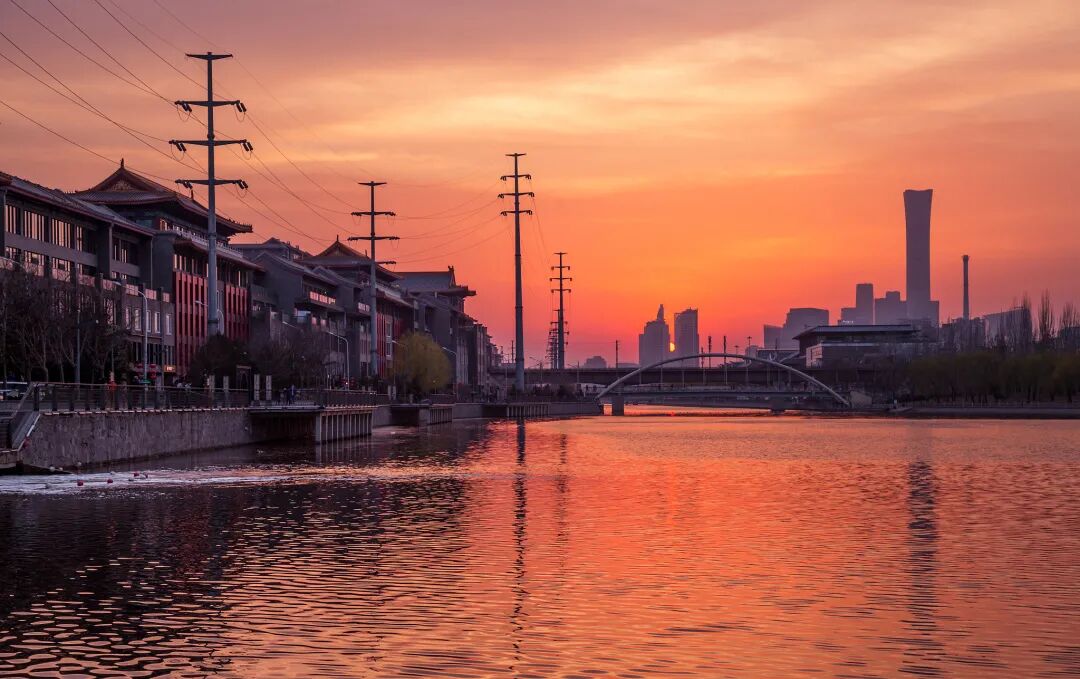 2021年3月23日,北京通惠河畔,春分刚过,红红的落日霞光染红了半边天 / 视觉中国