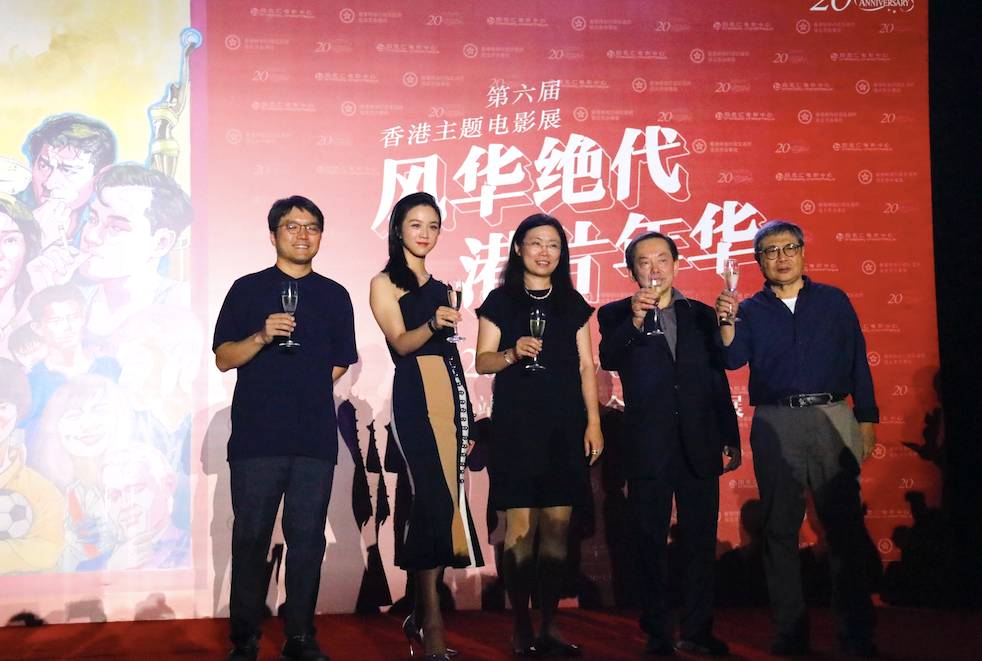 香港特别行政区政府驻京办主任傅小慧(中),安乐影片有限公司总裁江志强(右二),香港电影海报教父阮大勇(右一),香港著名导演许思维(左一),本次主题电影展的宣传推广大使、著名演员汤唯(左二)共同为电影展启幕。
