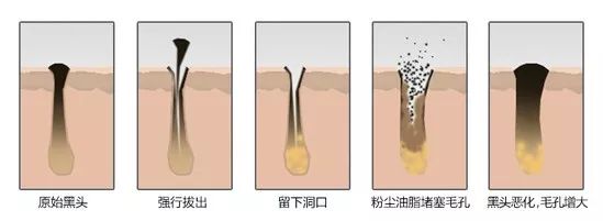 而这些油脂来不及排出,就都在毛孔开口的地方堵车啊!!!这么给你一堵~再混合些毛孔周围脱落的角栓,最终被氧化or由于粘黏空气中的尘埃而形成黑头惹
