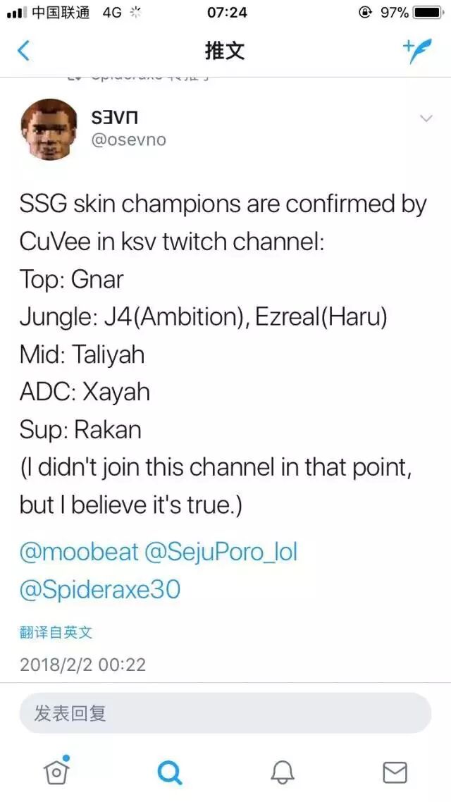 S7世界冠军战队SSG(现已改名KSV战队)的上单CuVee在直播间确定S7冠军皮肤已确定,分别是:Ruler:霞、CoreJJ:洛、Ambition:皇子、Haru:EZ 、Crown:岩雀、CuVee:纳尔