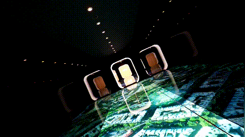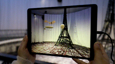 展览的第一部分就运用到了炫酷的AR技术,现场陈列着一个高耸挺拔的巴黎埃菲尔铁塔,虽然乍一看过去什么东西都没有,但当你使用现场的平板电脑,将屏幕高举,就可以看到眼前空旷的场地凭空出现了几个飞行器,特别神奇。