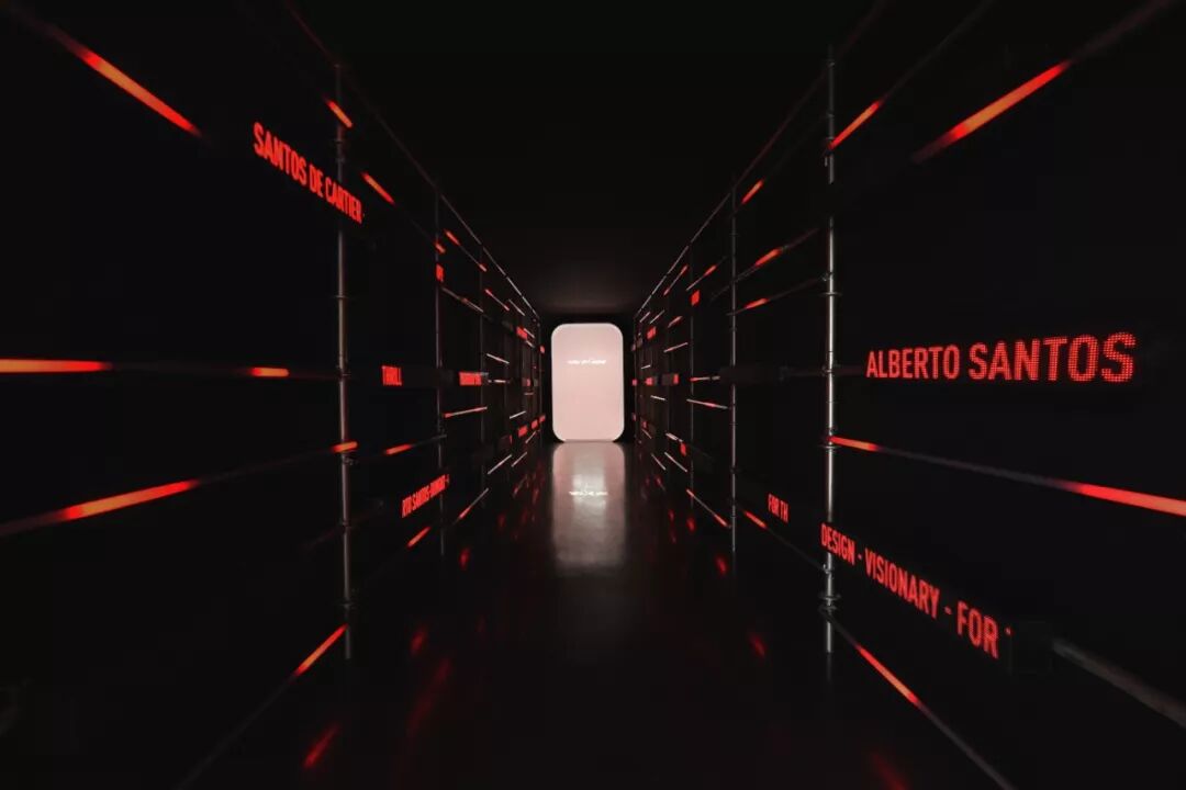 走过“高空长廊”,紧接着就是一处炫酷的“时空隧道”,现场用红色LED灯光铺就而成,快速闪过的字幕正是创始人卡地亚及传奇冒险家山度士的名字,还有“勇敢无畏”、“不惧挑战”这样的品牌精神,正能量满满。